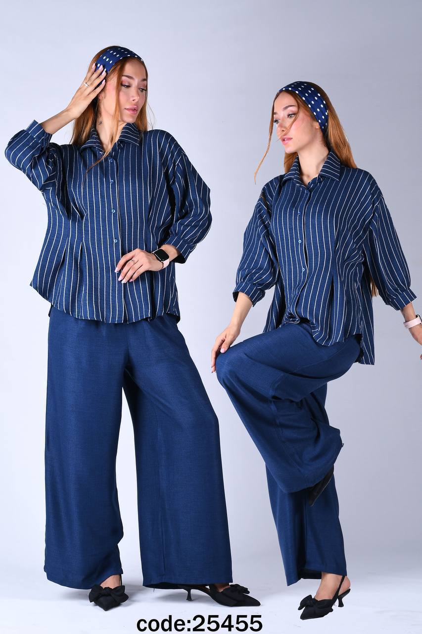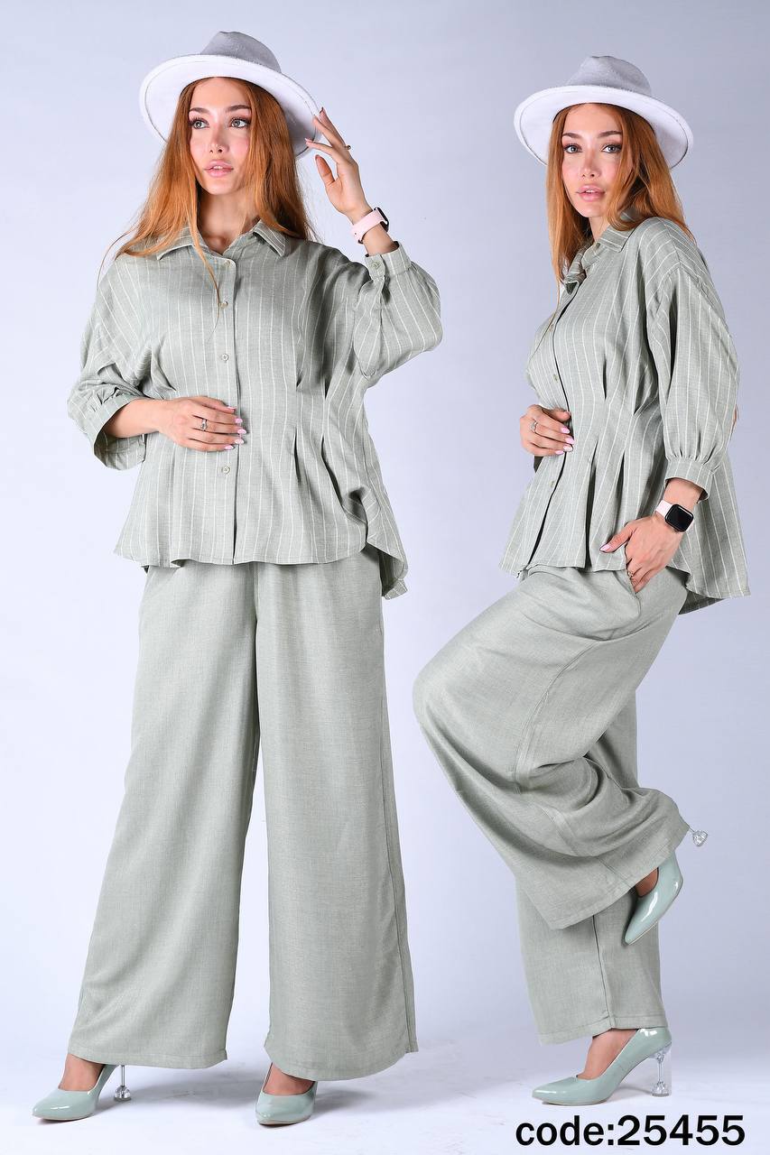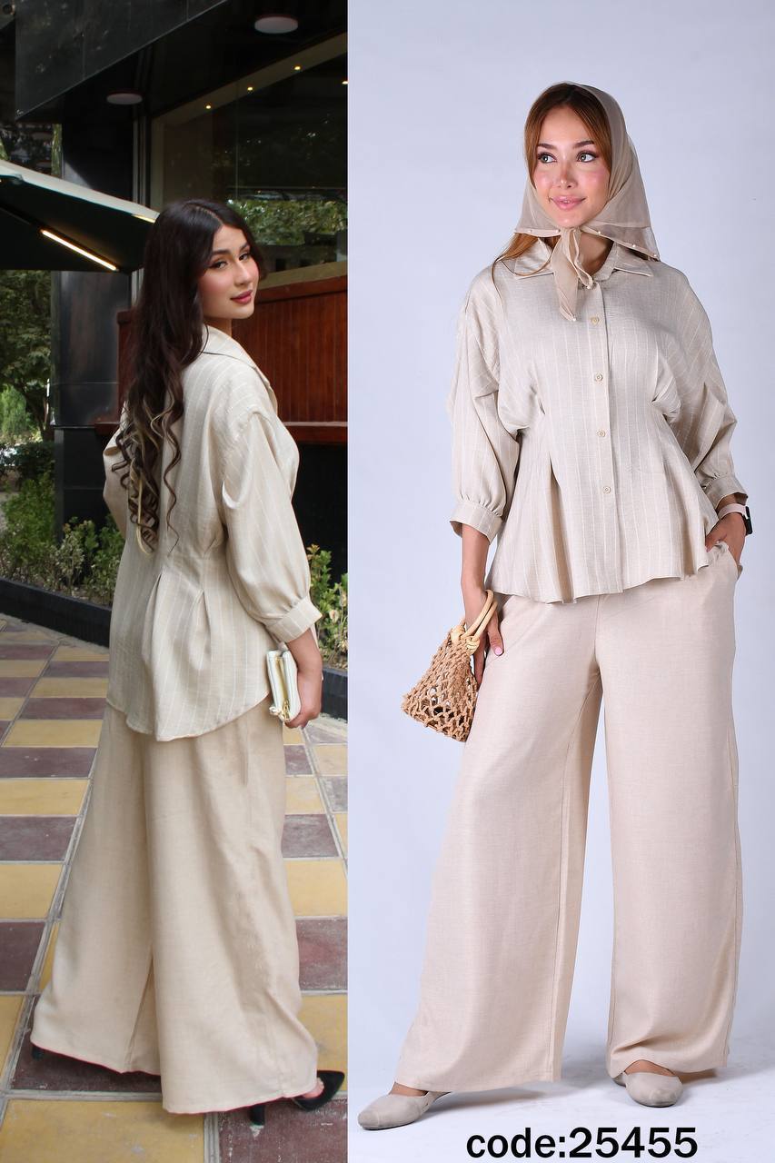 ست شومیز و شلوار جنس نخی پارچه بسیار خنک مدل شومیز راهراه پلیسه دار کد 25455