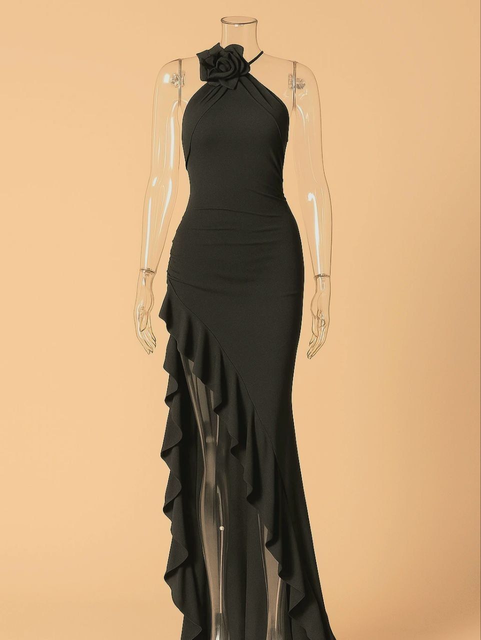 بند سرشانه دور گردنی، جلوی سینه گل پارچه ای, بدون آستین پشت تا نصف کمر باز